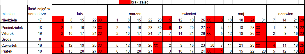 Daty zaznaczone powyżej na czerwono oznaczają brak zaplanowanych w tym dniu zajęć - są to zazwyczaj święta lub długie weekendy.